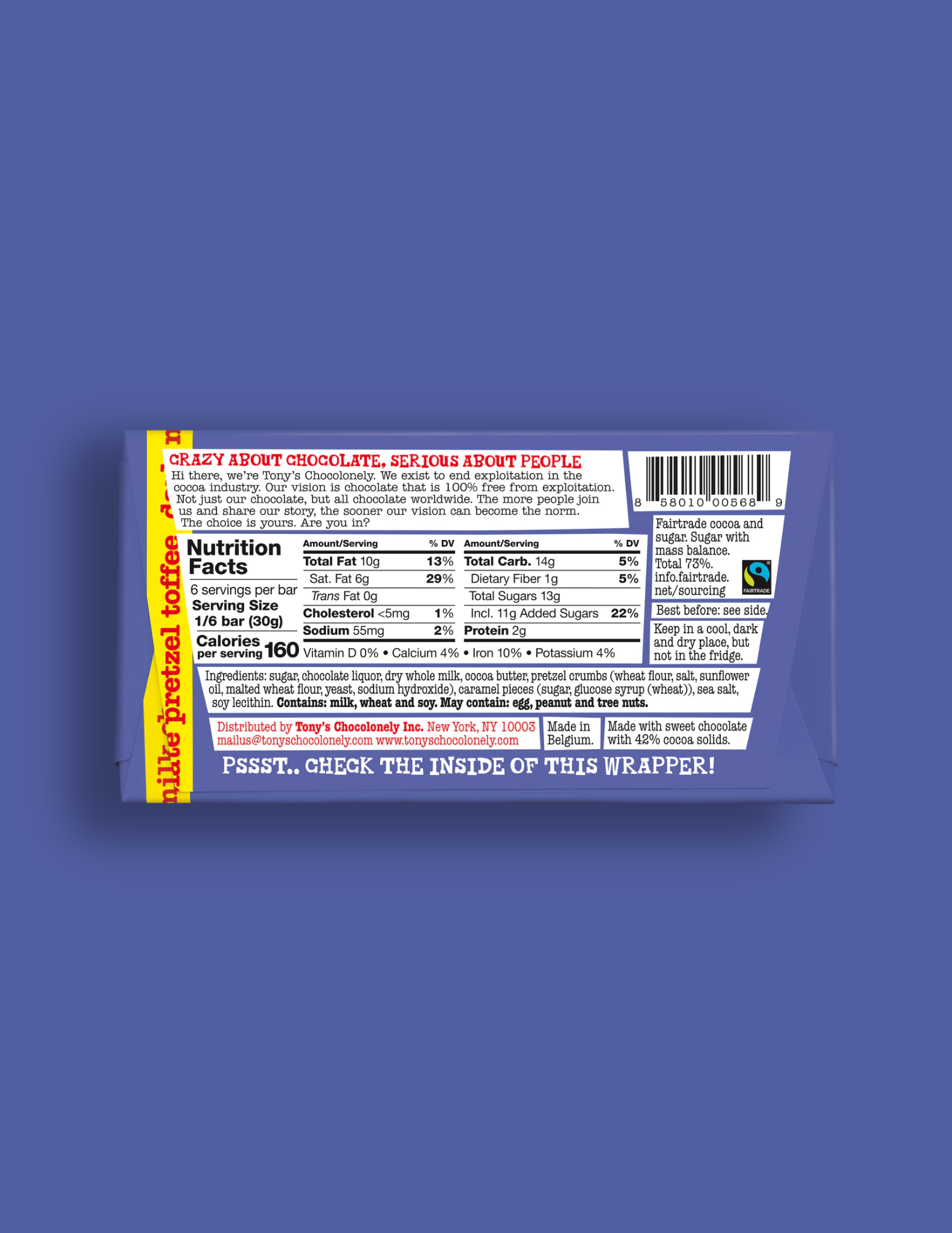 Belgian milk chocolate with pretzel crumbs and toffee. Cocoa solids: 42% minimum. Made in Belgium.