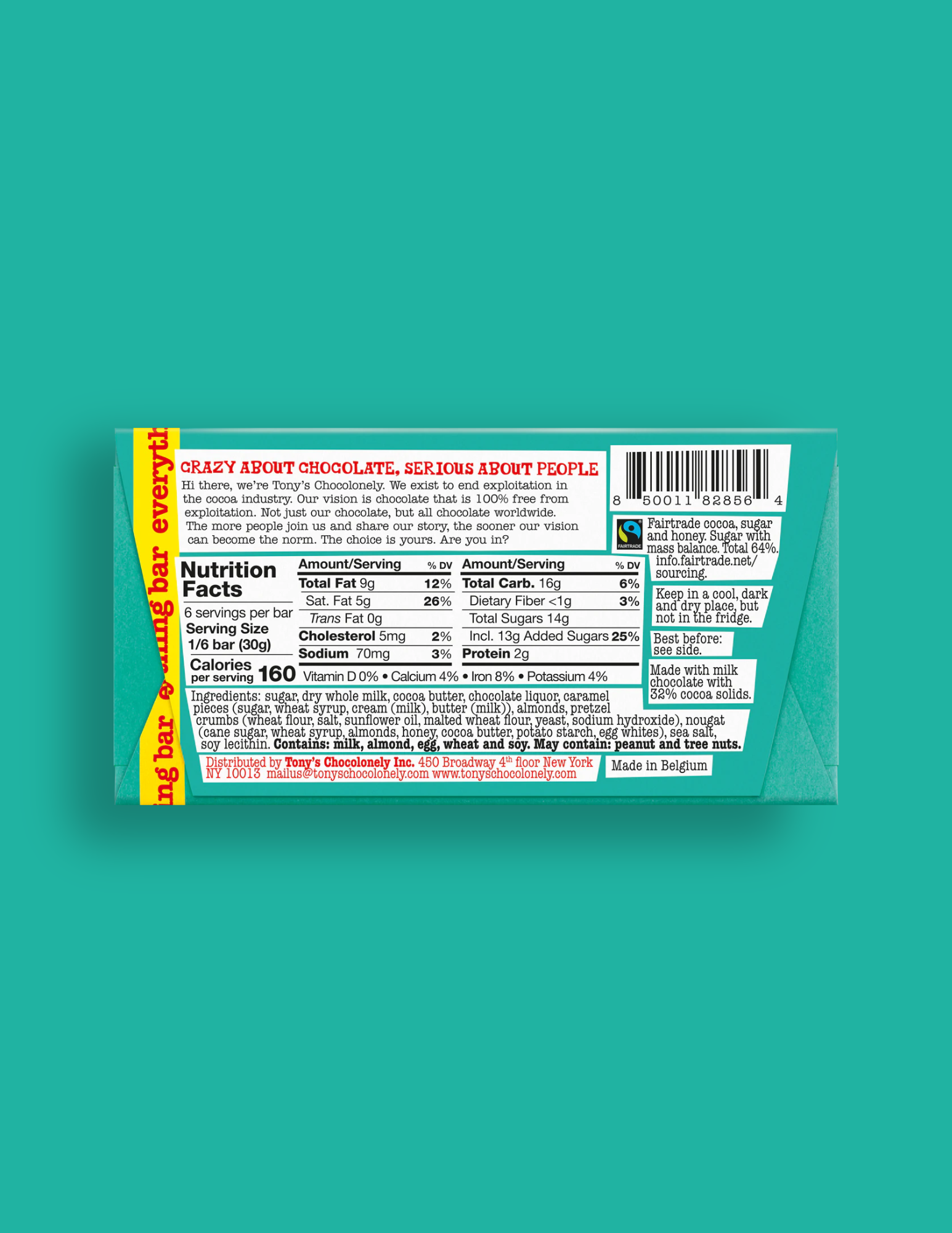 The bar that’s got it all. We put our top selling flavors in a blender, mixed ‘em all up and voila! A new choco star was born. Bite into milk chocolate packed with sticky caramel, crunchy almonds, savory pretzels, sweet nougat and flakey sea salt.